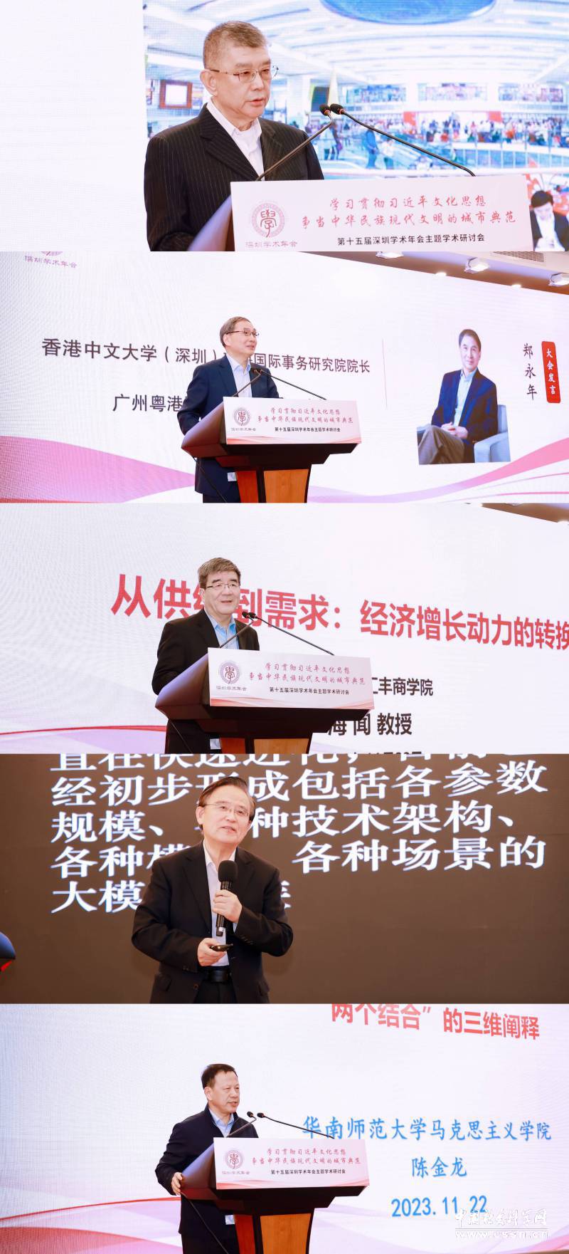 會議還舉行了學術(shù)交流活動,聯(lián)合國教科文組織“孔子獎章”獲得者、國家文化藝術(shù)智庫特聘專家、深圳讀書月組委會總顧問王京生以《全民閱讀是中華民族偉大復興的基礎(chǔ)工程》為題作大會發(fā)言;香港中文大學(深圳)前海國際事務研究院院長、廣州粵港澳大灣區(qū)研究院理事長鄭永年以《復合文化與大灣區(qū)的未來》為題作大會發(fā)言;北京大學校務委員會副主任、北京大學匯豐商學院原院長海聞以《從供給到需求:經(jīng)濟增長動力的轉(zhuǎn)換》為題作大會發(fā)言;中國人民大學教授、文化創(chuàng)意產(chǎn)業(yè)研究所所長,中國文化創(chuàng)意產(chǎn)業(yè)研究會榮譽會長金元浦以《元宇宙平臺與AI人工智能構(gòu)建典范城市新質(zhì)生產(chǎn)力》為題作大會發(fā)言;華南師范大學學術(shù)委員會副主任、馬克思主義學院教授陳金龍以《“兩個結(jié)合”的三維闡釋》為題作大會發(fā)言。