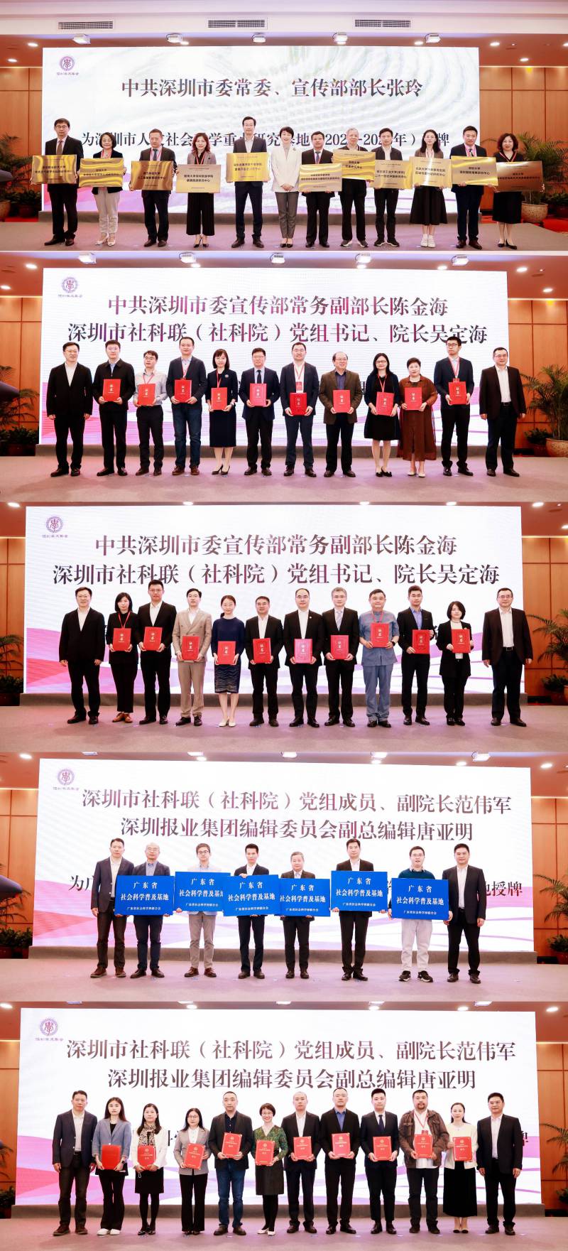 與會嘉賓為新評定的深圳市人文社會科學重點研究基地(2024-2026年)授牌、為第十一屆深圳市哲學社會科學優(yōu)秀成果獎頒獎、為廣東省社會科學普及基地和深圳市社會科學普及示范基地授牌 通訊員供圖