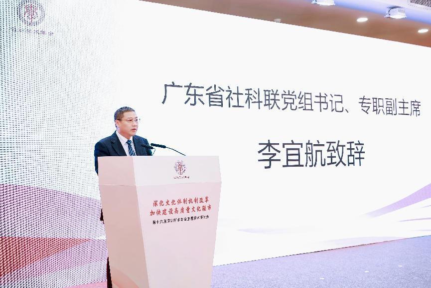 廣東省社科聯黨組書記、專職副主席李宜航致辭。他表示,本屆年會精準定位“深化文化體制機制改革加快建設高質量文化強市”這個鮮明主題,透過學術這個獨特視角,映照我們學習貫徹黨的二十屆三中全會精神的實際成效,問道深圳加快建設高質量文化強市的致勝密碼,把握的是文化發展大勢,觀照的是深圳改革創新,扛起的是先行示范責任,具有重要學術價值和實踐先導意義。他期待與會專家學者立足深圳、放眼全國,面向現代化、面向世界、面向未來,從深圳深化文化體制機制改革的頂層設計中解碼進一步全面深化改革的展開理路,從深圳深入推進綜合改革試點中找準激發全社會文化創新創造活力的主攻方向,從深圳加快建設高質量文化強市的豐富實踐中提煉帶有規律性的新認識,講清楚、講透徹深圳能夠一以貫之在推進中國式現代化建設中走在前列、當好尖兵的理論邏輯、實踐邏輯,切實讓學術賦能特區建設更加可感、可知、可行,更加生動地詮釋好習近平新時代中國特色社會主義思想的真理力量和實踐!