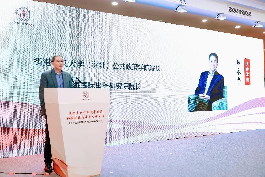 會議還舉行了學術交流活動,聯合國教科文組織“孔子獎章”獲得者、國家文化藝術智庫特聘專家王京生以《人工智能與文明形態及文化產業》為題作大會發言;中央黨校(國家行政學院)二級教授、中國行政體制改革研究會行政文化委員會主任祁述裕以《數智時代的文化體制機制改革》為題作大會發言;香港中文大學(深圳)公共政策學院院長,前海國際事務研究院院長鄭永年以《為什么要建構中國的自主知識體系》為題作大會發言;武漢大學新聞與傳播學院教授、博士生導師、珞珈特聘教授姚曦以《中國超大城市的國際傳播能力建設研究:以深圳為例》為題作大會發言;香港中文大學文化及宗教研究系客席副教授茹國烈以《港深文化雙子城》為題作大會發言; 科幻作家、南方科技大學人文科學中心教授、博士生導師、科學與人類想象力研究中心主任吳巖以《試談深圳科幻文化培育的方式選擇》為題作大會發言。